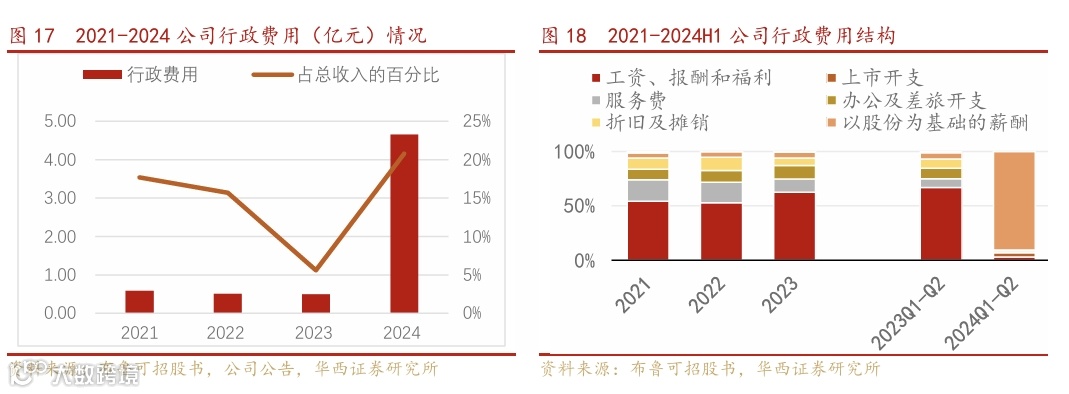 公司行政费用占比逐年下降,在2024年有大幅提高,主要是以股份为基础的薪酬部分。2021年至2024年,行政费用占比分别为17.7%、15.7%、5.6%和20.8%。