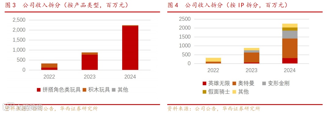 从产品类型来看,拼搭角色类玩具是主要增长来源。2022年公司推出拼搭角色类玩具,2023、2024年收入分别为7.7、22.0亿元,同比增速分别为554%、186%,其中前三大IP奥特曼、变形金刚、英雄无限在2024年分别同比增长97%、263%、383%,均实现几乎翻倍的增长。
