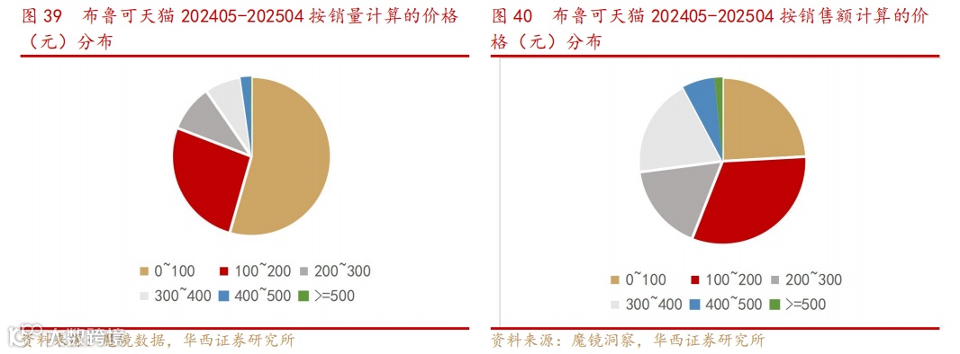 亲民定价策略,大部分销量和销售额由低价商品贡献。公司热销的大众价格带产品定价为39元,可触达更广泛消费者的平价价格带产品定价为9.9-19.9元。根据魔镜数据,布鲁可天猫旗舰店2024年5月-2025年4月的销量中,有54%来自100元以下产品,80%来自200元以下的产品,按销售额的占比来看, 56%的销售额由200元以下产品贡献,36%的销售额由200-400元商品贡献。公司近年来陆续推出价格较低的产品,包括畅销的奥特曼系列中的英雄总动员星辰版定价9.9元、奥特曼群星版定价39元,显著低于国际品牌同类产品(万代基础款50–99元、乐高IP款300–600元)。