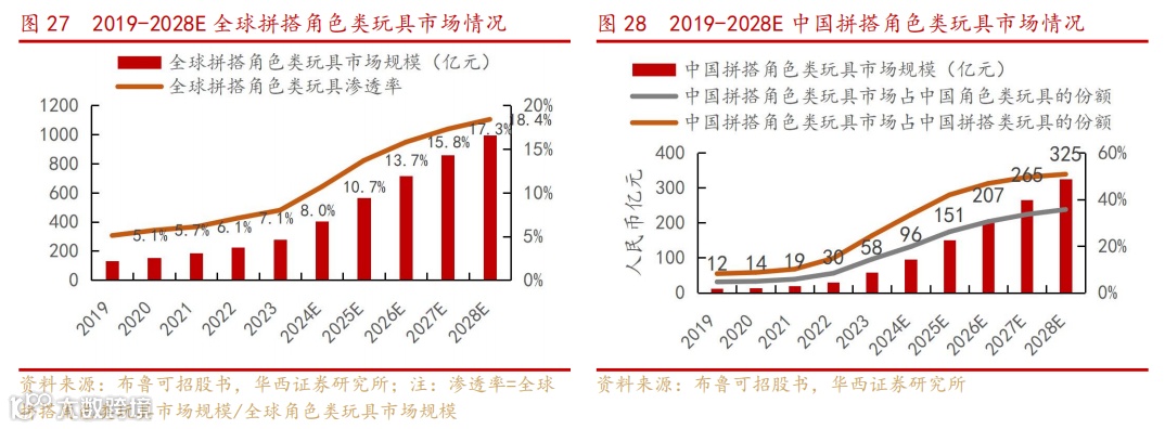 中国拼搭角色类玩具市场正处高速增长期,2023-2028年预计CAGR达41.3%(弗若斯特沙利文),2028年规模将突破325亿元。中国拼搭角色类玩具细分市场占中国角色类玩具市场的百分比预期将由2023年的14.3%增至2028年的35.6%。