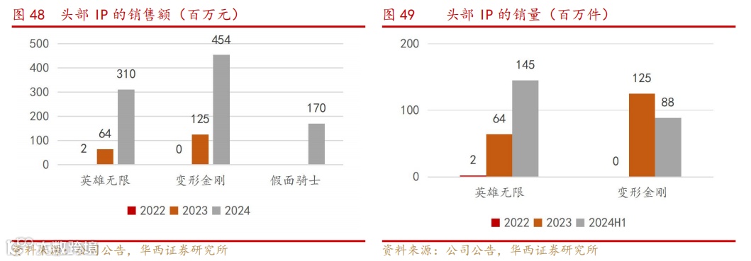 复用经销渠道资源,变形金刚、英雄无限、假面骑士等IP在推出后实现了快速增长。英雄无限、变形金刚、假面骑士分别为2022、2023、2024年推出的新IP角色,至2024年已成为公司除奥特曼之外的三大IP,2024年分别实现销售额3.1、4.5、1.7亿元。