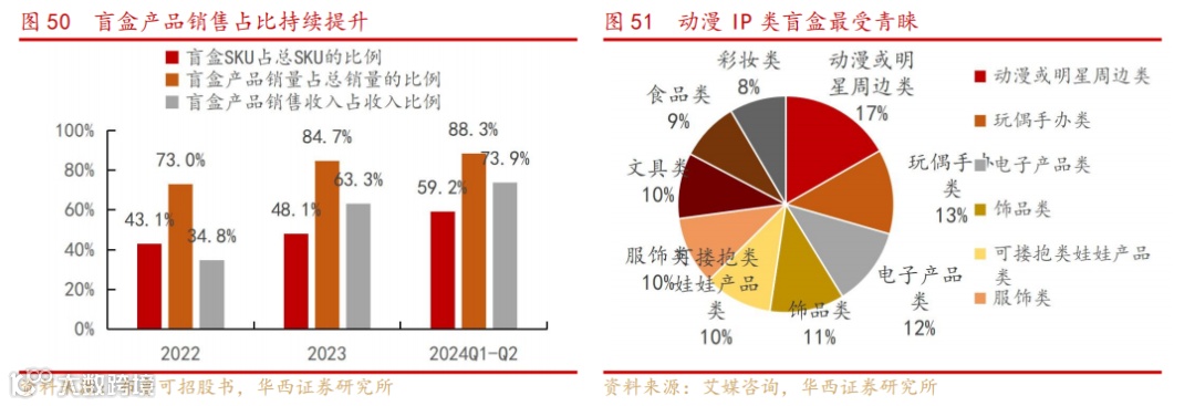 盲盒模式顺应情绪消费趋势,成为快速增长的核心产品。盲盒产品在公司业务中的占比持续攀升:2021年至2023年,盲盒的销量从0增长至3168万件,收入占比从0提升至63%,达5.55亿元。通过盲盒形式,公司成功扩大IP影响力(如奥特曼、变形金刚等),增强消费者粘性。