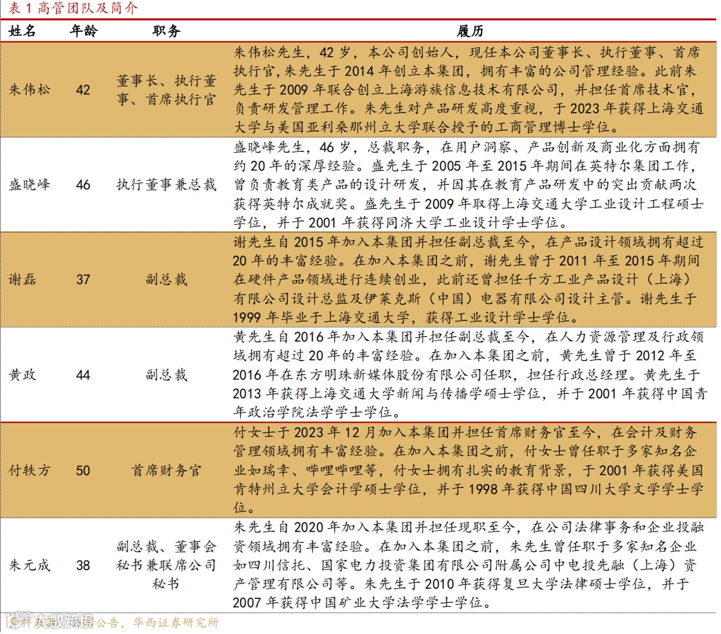 创始人业务与管理经验丰富,核心管理层在玩具及科技领域具备广泛的专业知识和丰富的实践经验。创始人朱伟松先生有丰富的业务及管理经验,其于2014年12月创立本集团,自2014年12月起担任布鲁可科技的执行董事及董事长。在此之前,朱先生于2009年5月联合创立了上海游族信息技术有限公司,自其成立起至2015年2月担任首席技术官,主要负责研发管理工作;于2014年5月,上海游族信息技术有限公司的业务通过游族网络股份有限公司的重大资产重组在深圳证券交易所上市(股票代码:002174),朱先生于2014年6月至2016年4月担任游族网络股份有限公司监事会主席。朱先生一直高度重视产品研发,对行业趋势、品类创新、商业开拓与合作具有深刻洞察。