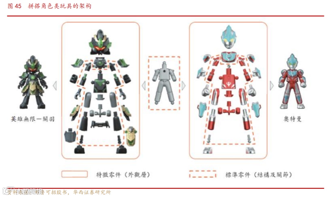 独创“骨肉皮”三层结构:“通用素体骨架(骨)+特征零件(肉)+可替换外甲/配件(皮)”,实现跨IP零件兼容。拼搭角色类玩具的架构从人体结构汲取灵感,以效仿其稳定性、可动性及外观。标准零件主要用作玩具结构及关节,可在不同型号的产品之间功用,单个产品的大部分零件都是标准零件。通过标准化结构,提升了消费者在拼搭过程中的体验。外观层(如IP角色的独特盔甲或服装)用于还原设计及叙事元素,这些零件设计由多种图案、颜色及纹理,丰富角色外观,并高度还原角色造型。