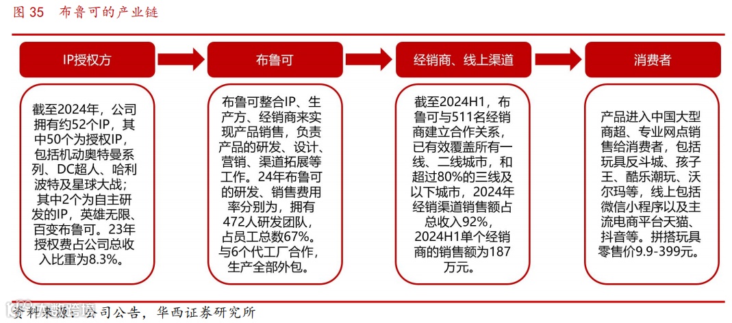 布鲁可的产业链涉及4个环节,IP授权方、布鲁可、经销商等渠道、消费者。公司从IP授权方获取授权后,进行产品的开发设计、生产、营销、渠道拓展等工作。将产品销售给经销商,或通过线上渠道进行销售。截至2024年,公司92%的收入来源于经销商,目前经销商已覆盖全国所有一二线城市及80%以上的三线及以下城市,7%的收入来源于线上销售。经销商将商品销售给大型线下商超,包括玩具反斗城、孩子王、沃尔玛等,进而销售给消费者。