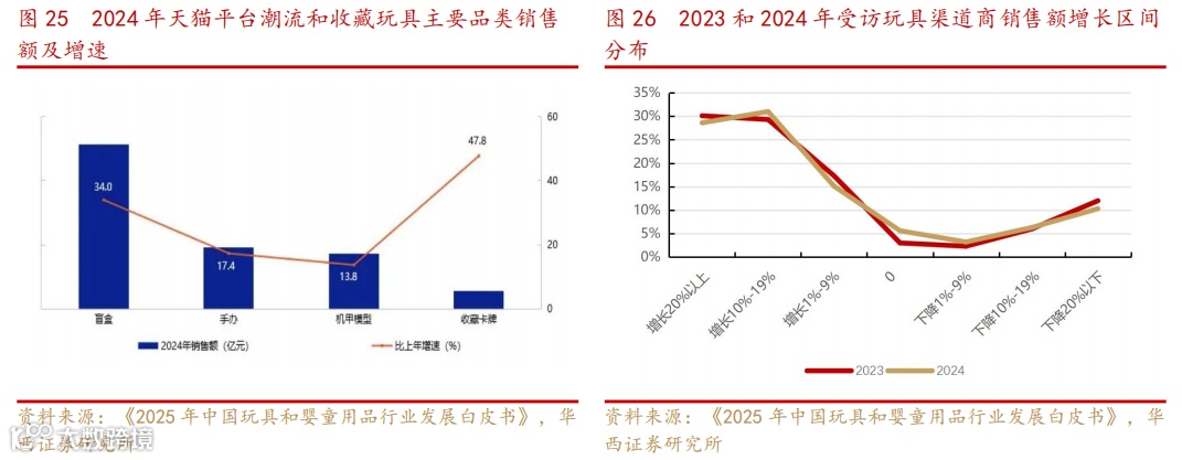 潮流和收藏玩具品类保持高增速。收藏卡牌销售额比上年增幅最大,为47.8%;销售额最大的品类是盲盒,增幅34.0%;机甲模型均价最高,为239.5元,比上年增幅最大,为12.9%;收藏卡牌TOP10品牌集中度最高,为80.9%。