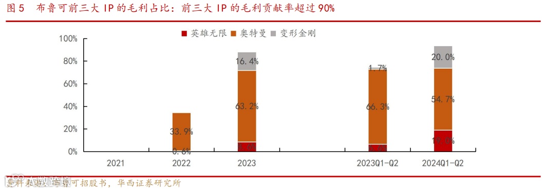 三大IP贡献了绝大部分毛利,奥特曼IP表现强劲。2023年奥特曼、变形金刚、英雄无限的毛利率分别为47%、54%、56%。奥特曼自2022年起成为毛利贡献的核心来源,占比连续两年超过50%,变形金刚毛利贡献率从2023年起快速提升,至2024H1已达到20%,展现出强劲的增长势头。但是奥特曼与变形金刚都属于授权IP,需考虑版权到期的可持续性。英雄无限作为自有IP,毛利贡献从2022年的0.6%上升至2024H1的19.0%。