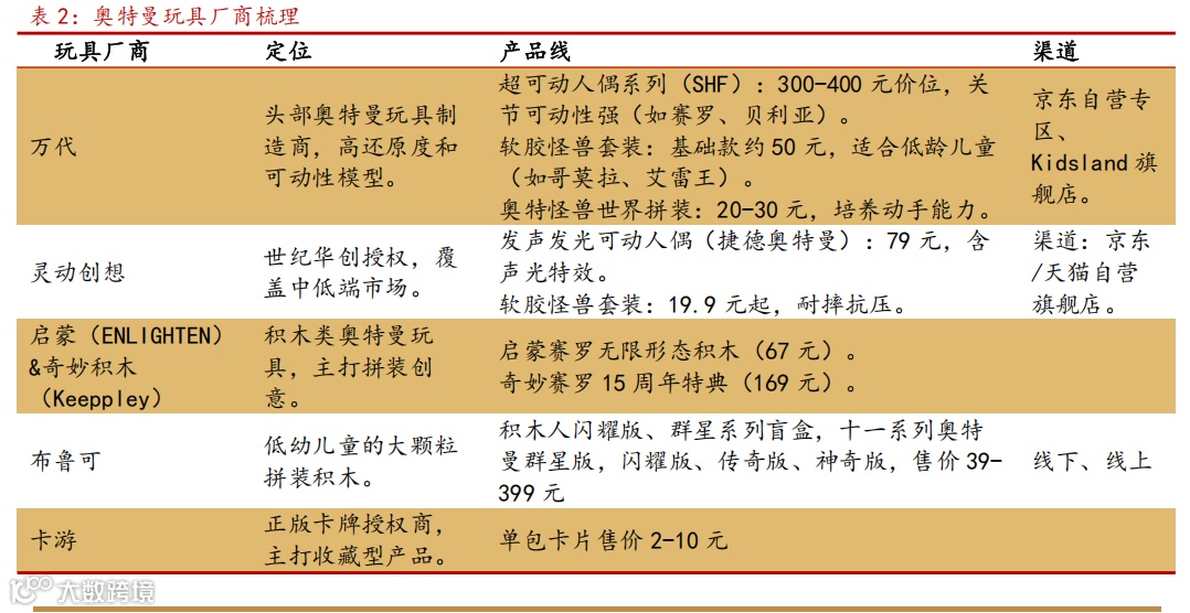 目前国内的奥特曼玩具以万代、布鲁可、卡游、灵动创想、启蒙(ENLIGHTEN)、奇妙积木(Keeppley)为主。几大玩具定位各异,万代偏高端收藏,还原度与可动性最优。国产玩具定位儿童日常玩具,布鲁可、灵动创想(声光互动)、启蒙/奇妙(拼装乐趣)性价比突出。布鲁可、灵动创想的IP授权均来自上海新创文化发展。布鲁可在中国的奥特曼IP授权已延长至2027年,在其他国家的授权将于2025年到期。