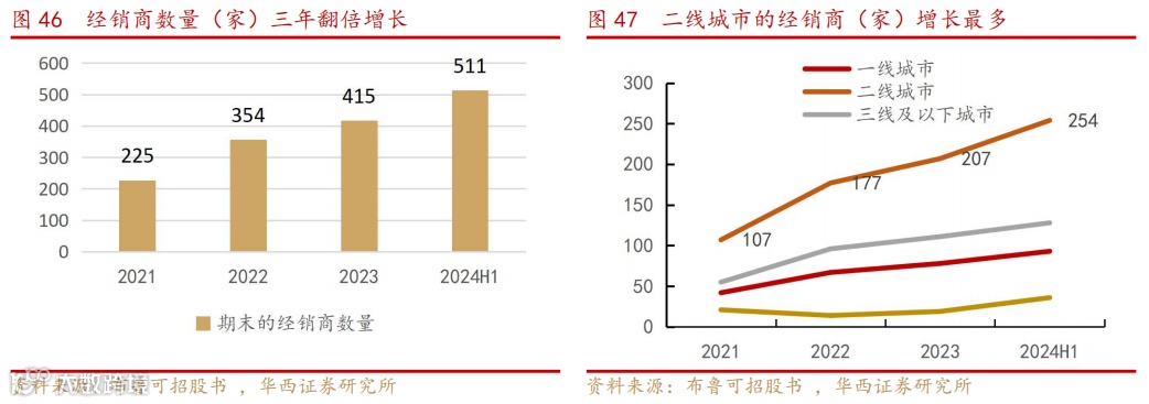 布鲁可重点布局下沉市场,覆盖全国约80%的区域。2021年-2024H1,公司合作的经销商从225家增长至511家,包括三、四线城市的商超和学校周围的文具店、小卖部。对于旗舰店,2025年公司仅计划在选定的一线城市开设一家。