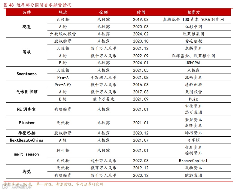 香水核心为提供情绪价值,中国市场潜力巨大。美妆市场相对平稳下香水市场却展现强劲韧性,据 MoodMedia 的气味市场调查,人每天产生的情绪中有 75%是由气味引起的,后疫情时代人们对情绪价值的追求持续提升,带动香水香氛市场成长。欧睿预计 2024 年全球香水香氛市场规模预计将在 570 亿至 610 亿美元之间,2027 年将超过 792.96 亿美元。根据欧莱雅 2023 年度电话会,中国香水市场仅占全球6%,相比护肤品全球份额 27%还有巨大空间。企查查数据显示 2023 年中国香氛相关企业近 10 万家,创近 10 年新高,2024 年欧莱雅宣布对国货高端香水香氛品牌观夏进行少数股权投资,此前闻献、气味图书馆、melt season 等国货香氛品牌也得到国际美妆巨头投资。香水品牌基于文化沉淀,当前国货香水在营销、品牌等方面还较为初级,同时“东方香”的概念尚未被深度挖掘,预计竞争格局仍将波动。