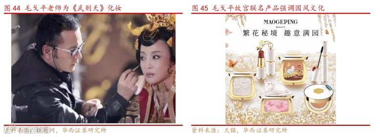 个人 IP 映射品牌,奠定品牌发展基础。与迪奥、香奈儿等品牌创始人相似,毛戈平不仅是美妆行业的实践者,更是行业审美的塑造者。他将戏曲妆容的层次感、东方人物造型的立体雕塑技法,与现代化妆理念相结合,赋予品牌强烈的艺术气息。这种深厚的个人品牌 IP,使毛戈平品牌在高端专业彩妆领域形成独特的竞争壁垒,成为国货品牌中少有能够讲述深刻品牌故事的代表。此外,毛戈平先生长期参与化妆艺术的教学、出版专业教材,并亲自推广美妆文化,使品牌在专业彩妆市场中积累了深厚的口碑。这种由创始人个人影响力带动品牌成长的模式,使毛戈平品牌具备更强的消费者黏性和行业内的权威性,为其未来继续成长奠定了坚实基础。