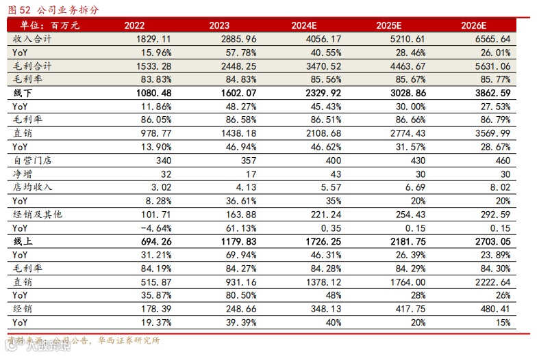 基本假设:公司线下专柜稳步扩张,预计每年按 30-40 家左右增长,同时在上市之后品牌知名度扩大之下,对比国际一线品牌单店收入也有较大增长空间,线下经销渠道中速增长;线上直销及经销受益于品牌的差异性定位,于 2023 年爆发增长后预计中期内仍将超越行业平均增速。