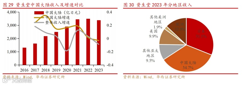 资生堂于全球化扩张中注重本土化,以中国市场为例,其早在 2001 年就设立了中国研发中心,为首个在中国设立研发中心的美妆集团,并在 2006 年推出了专为中国女性打造的 urara(悠莱)品牌,对中国市场的重视与本土化运营使得中国大陆收入增速显著超过集团整体。根据中妆网,资生堂在全球已拥有中国北京、上海浦东和东方美谷、日本横滨和神户、美国新泽西、法国以及新加坡 8 家研发中心,充分考虑区域消费者护肤需求差异的同时,也将研发创新成果形成一个整合系统,借本土化运营和海外成熟品牌并购,集团分地区收入均衡,将东方美妆带向世界。