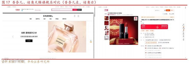 香奈儿以直营网络为主,致力于为消费者提供最直接、最优质的购物体验。香奈儿销售渠道主要包括直营店、专卖店和电商平台。直营店和专卖店主要分布在全球各大城市,为消费者提供高品质的购物体验。2019 年以前,在中国香奈儿仅有官网作为中国区域的线上销售渠道,但近几年香奈儿也积极拓展线上销售渠道,与天猫、京东等电商平台合作,满足消费者的多元化需求。