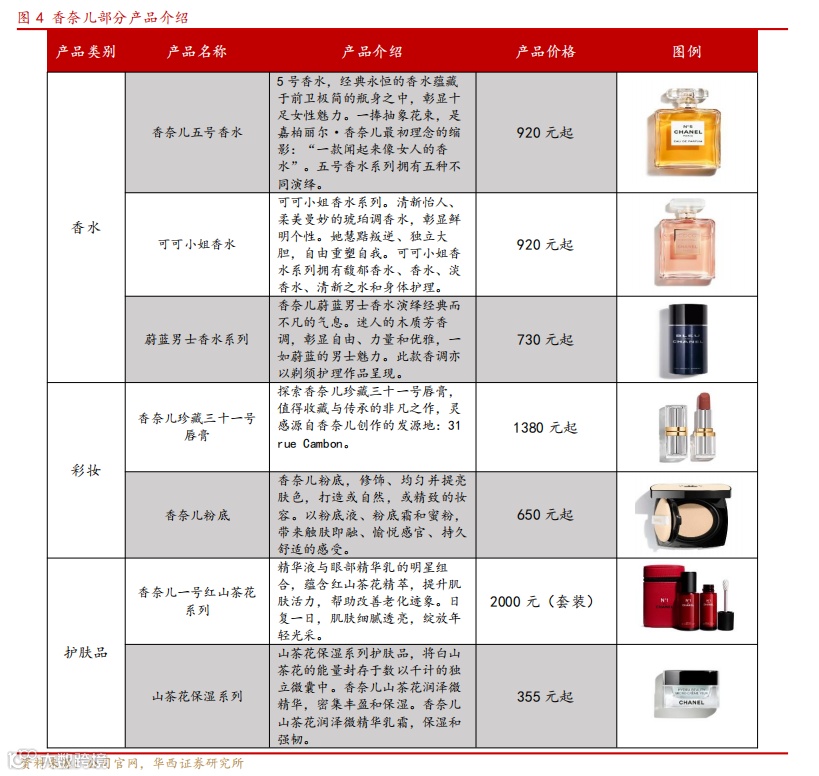 香奈儿美妆三大品类占比均匀。根据美觉测算,香奈儿的香水、彩妆、护肤三大板块销售额接近于3:3:4。围绕香水产品在全世界的高知名度。香奈儿不断拓展业务线,推出彩妆、护肤等产品。山茶花,作为香奈儿的另一大标志性元素,被巧妙地融入到了品牌的产品中。山茶花系列彩妆和护肤品,以其清新、自然且富有活力的特点,赢得了广大消费者的喜爱。无论是山茶花保湿面霜,还是山茶花唇膏,都以其卓越的品质和独特的设计,让消费者在享受美丽的同时,也感受到了香奈儿品牌的独特魅力。