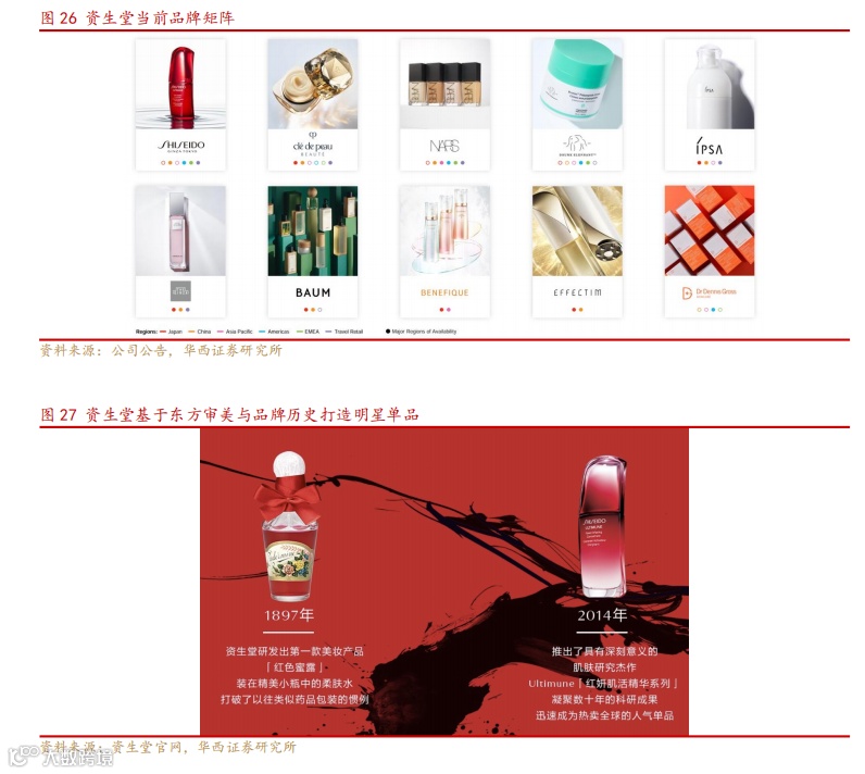 资生堂于日本经济泡沫严重的 80 年代孵化了 CPB、IPSA 等高端美妆品牌,后续借助海外并购打入欧美美妆市场。单品方面,资生堂以西方技术与东方审美融合,早在1897 年即推出经典单品 EUDERMINE 红色蜜露,曾在柏林大学留学的时任东京帝国大学教授长井长义博士,以其研究成果为基础,致力于开发出与药品相同高品质的化妆品,如今演变为“红腰子”精华成为资生堂品牌核心大单品之一。
