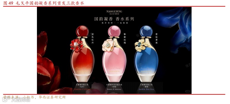 毛戈平初步探索香水线,看好国货高端美妆跨界突围。2019 年毛戈平与故宫联名的第一季产品中即推出了御香华露香水礼盒,同时去年 8 月在抖音上线了毛戈平老师与胡兵合作的《香迹》综艺,两人在法国围绕“奥运、美学、香水”展开文化探索交流之旅,我们判断毛戈平品牌借助毛老师个人影响力及前期产品探索,跨界进入香水领域将较为顺利,高端东方品牌形象可继续沿用,当前已初步推出“国韵凝香”系列挚爱玫瑰、国色牡丹、香廷鸢尾三支香水,看好公司充分发挥成熟渠道优势与忠实会员体系在香水产品线上实现突破。