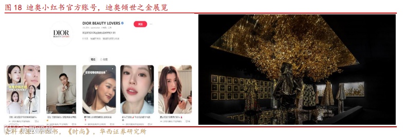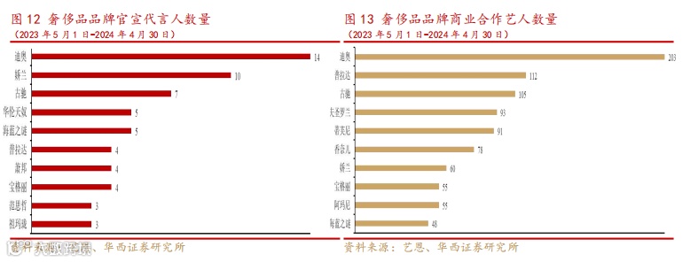 善用名人效应,公司与顶流明星合作频繁。迪奥非常善于利用名人效应来提升品牌形象。从查理兹·塞隆,再到国内的迪丽热巴、王俊凯等,迪奥选择的品牌形象代言人不仅符合品牌的定位,而且具有极大的知名度。这种合作不仅增强了品牌的曝光度,还提升了品牌在消费者心中的奢华形象与地位。2023 年 5 月 1 日- 2024 年 4 月 30 日期间,迪奥官宣品牌代言人 14 位,与超过两百位商业艺人开展商业合作,这两项数据在中国奢侈品市场各大品牌中均位列第一。
