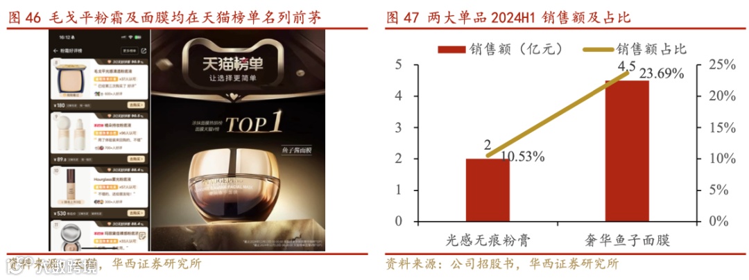 以中式美学和专业化妆为核心,初步打造大单品矩阵。毛戈平深耕中国传统艺术,其彩妆产品大量融入戏曲、宫廷、敦煌壁画等元素,在色彩搭配、妆容塑造和产品包装上体现出强烈的文化归属感。例如,光感无痕粉膏系列精准展现东方女性面部结构的立体感,故宫联名系列则以精美工艺和东方意象增强品牌价值。这种深度结合中国传统美学与现代彩妆科技的方式,使毛戈平在高端市场形成差异化定位,创造出“中式高端美妆”概念。借由文化输出与强产品力,毛戈平品牌已初步孵化出数个大单品,如光感无痕粉膏及奢华鱼子面膜,2024H1 零售额分别超过 2 亿元和 4.5 亿元,约占美妆产品销售额的 10%和 23%以上,后续随着 IPO带动品牌美誉度进一步提升,叠加流行趋势与毛戈平品牌形象共振,看好公司继续打造明星单品。