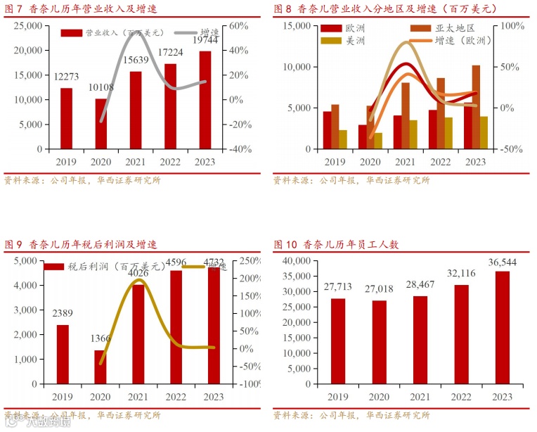 从地区分布来看,欧洲、亚太地区和美洲都是香奈儿的重要市场。欧洲市场在经历了2020 年的低谷后,迅速恢复并实现了持续增长;亚太地区在最近几年成为香奈儿的另一增长极,实现高速增长;美洲市场相对来说在疫情后营业收入增速较慢。