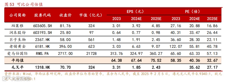 根据以上假设,我们预测公司 2024-2026 年营收分别为 40.56/52.11/65.66亿元,受实际上市后股本变化影响,每股收益为 1.85/2.43/3.11 元(前值1.93/2.53/3.24 元),对应 2025 年 2 月 5 日收盘价 70.70 港元(港元兑人民币0.9340:1),PE分别为 35.62/27.17/21.26 倍。公司在竞争激烈的美妆行业中树立了深入人心的国风和专业高端品牌形象,护城河深厚,上市后有望进一步增强综合实力,给予“买入”评级。