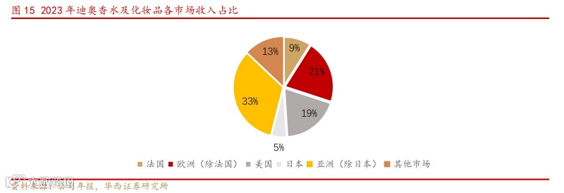 全球化市场布局,各大市场共同推动企业美妆线收入增长。2023 年,在不同地区收入占比中亚洲(除日本)贡献了 33%的收入,成为公司美妆线收入占比最多的区域。欧洲(除法国)紧随其后,占比 21%,同样是迪奥的重要市场。美国占比 19%,体现了品牌在美国的广泛影响力。而法国作为迪奥的发源地,虽占比相对较小(9%),但仍是公司收入的重要组成部分。多元化的收入来源反映了迪奥在全球的影响力。迪奥成功地在全球各大市场中实现了广泛布局,保证了公司收入增长的稳定性,降低了单一市场变化所带来的风险。