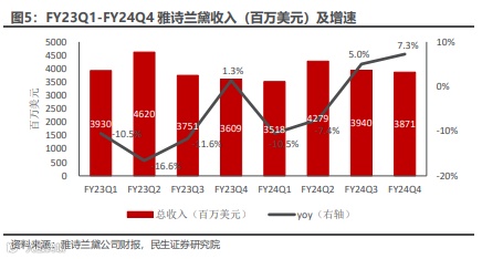 根据公司财报,FY24Q4(2024 年 4-6 月)期间,雅诗兰黛实现营收 38.71亿美元,同比+7.26%。