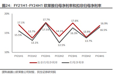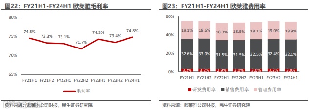 FY24H1(2024 年 1-6 月),公司毛利率为 74.83%,同比+0.55Pct;研发费用率为 3.02%,同比-0.01Pct;销售费用率为 32.14%,同比-0.34Pct,主要系收购 Aesop 和部分地区恶性通货膨胀的影响;管理费用率为 18.88%,同比+0.81Pct,主要系收购 Aesop 以及对公司自身长期发展的投资所致。FY24H1,公司实现归母净利润 36.556 亿欧元,对应归母净利率 15.53%,同比+0.2Pct;实现扣非归母净利润 37.446 亿欧元,对应扣非归母净利率 16.93%,同比-0.65Pct;实现经营利润 45.991 亿欧元,对应经营利润率 20.79%,同比+0.09Pct。