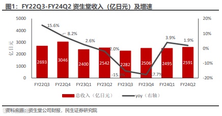FY24Q2(2024 年 4-6 月),资生堂实现营收 2590.83 亿日元,同比+1.93%。