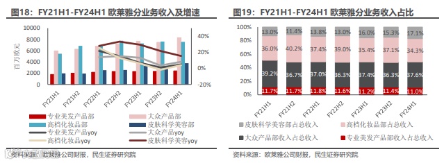 分业务来看,1)专业美发产品类实现营收 24.3 亿欧元,同比+4.88%;2)大众化妆品类实现营收 83.2 亿欧元,同比+8.26%;3)高档化妆品类实现营收75.8,同比+3.98%;4)皮肤科学美容类实现营收 37.9 亿欧元,同比+15.47%。