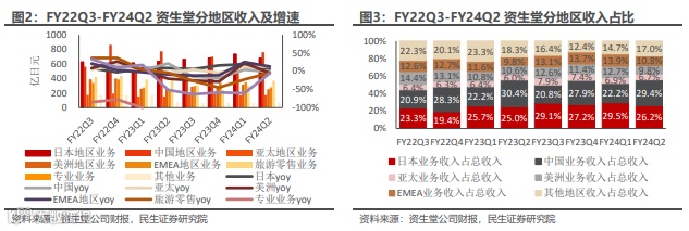 分地区看,FY24Q2 期间:1)日本地区实现营收 679.45 亿日元,同比+7.03%,占总营收 26.23%,营收高增主要系核心品牌贡献高以及价格上涨;2)中国地区实现营收 761.96 亿日元,同比-1.52%,占总营收 29.41%,营收下降主要系中国消费者情绪低迷且消费行为改变,财报分析显示中国地区消费者在该财报期间比起消费更愿意进行储蓄;3)亚太地区实现营收 173.32 亿日元,同比+13.33%,占总营收 6.69%;4)美洲地区实现营收 254.56 亿日元,同比-5.15%,占总营收9.83%,营收下降主要系临时性产量降低导致运输货量少;5)EMEA 地区(欧洲、中东、非洲)实现营收 280.41 亿日元,同比+13.01%,占总营收 10.82%,主要系聚焦的皮肤护理和香氛品牌引领增长;6)旅游零售业务实现营收 370.35 亿日元,同比-4.75%,占总营收 14.29%,营收下降原因参考中国地区销售疲软原因。
