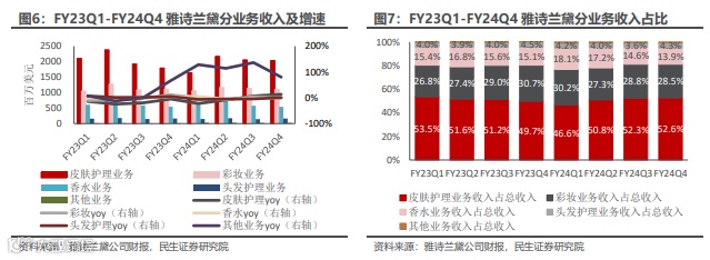 分地区来看,FY24Q4 期间:1)美洲地区实现营收 10.14 亿美元,同比-5.32%,占总营收 26.19%,营收下降主要系北美地区高端美容市场增长趋缓(尤其是线下渠道),且北美地区消费者通胀压力较大所致;2)EMEA 地区(欧洲、中东及非洲地区)实现营收 16.52 亿美元,同比+31.84%,占总营收 42.68%,主要由亚洲旅游零售业务的持续增长驱动;3)亚太地区实现营收 12.05 亿美元,同比-7.45%,占总营收 31.13%,营收下降主要系中国大陆地区高端美容市场进一步疲软以及中国香港特别行政区出货量减少所致。