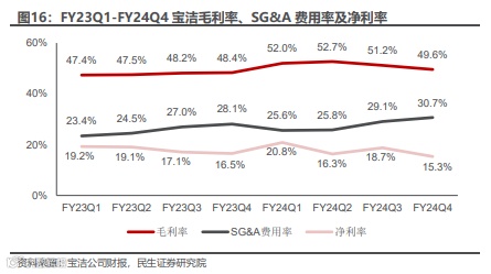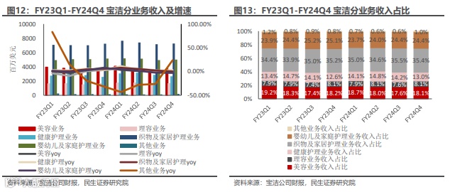 分业务来看,FY24Q4 期间:1)美容业务收入 37.24 亿美元,同比-0.59%;2)理容业务收入 16.57 亿美元,同比+0.06%;3)健康护理业务收入 26.74 亿美元,同比+3.24%,其中口腔护理类业务表现较好;4)织物及家居护理业务收入72.65 亿美元,同比+0.33%;5)婴幼儿及家庭护理业务收入 50.09 亿美元,同比-2.85%;6)其他业务收入 2.03 亿美元。