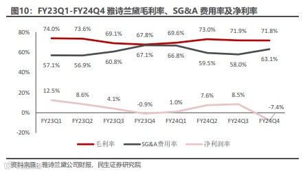 FY24Q4 期间,公司毛利率为 71.76%,同比+3.99Pct;SG&A 费用率为63.14%,同比-3.92%。公司实现净利润-2.86 亿美元,对应净利润率-7.39%,同比-6.5Pct;实现归母净利润-2.84 亿美元,对应归母净利润率-7.34%,同比6.42Pct,利润端承压主要系中国市场和亚洲旅游零售市场疲软所致;实现经营利润-2.33 亿美元,对应经营利润率-6.02%,同比-5.88Pct。