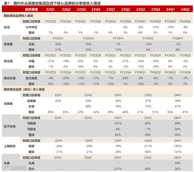 我们对四大国际化妆品集团(资生堂、雅诗兰黛、宝洁、欧莱雅)最新一期财报内容梳理,发现四大国际化妆品集团在中国地区/亚太地区业绩普遍承压:资生堂 FY24Q2(2024 年 4-6 月)中国地区营收 762.0 亿日元/yoy-1.5%,雅诗兰黛FY24Q4(2024 年 4-6 月)亚太地区营收 12.1 亿美元/yoy-7.5%,宝洁 FY24Q4(2024 年 4-6 月)在大中华区的有机销售额同比下降 8%,欧莱雅 FY24H1 在中国市场因消费者信心不足持续疲软;结合对比国货上市美妆龙头业绩,我们发现,在目前消费整体承压,24 年上半年美妆消费景气度承压情况下,国货美妆龙头彰显出更强的增长韧性。