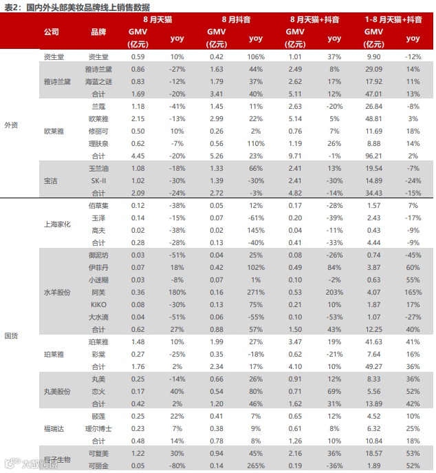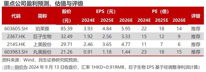 目前整体消费承压的趋势相对比较明显,但是对比国际化妆品公司和国货美妆龙头最新一季的财报表现来看,可以发现国货美妆龙头在目前消费整体承压的情况下更具增长韧性,考虑到国际美妆龙头在国内市场业绩略有承压、调整相对较慢,以及一些生产商或渠道商直接供应的低知名度品牌也在需求承压情况下加速出清,行业竞争格局有望优化,国货美妆龙头的马太效应进一步凸显,强者更强,有望获得更多市场份额,我们推荐珀莱雅、巨子生物、上美股份、丸美股份,建议关注福瑞达、水羊股份、上海家化。