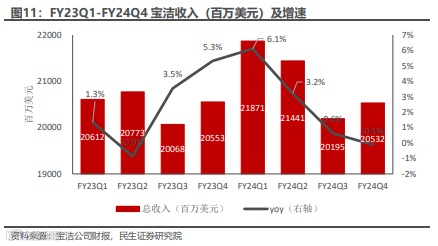 FY24Q4(2024 年 4-6 月),宝洁公司实现营收 205.32 亿美元,同比-0.1%,定价策略带来了 1%的销售额增长,外汇交易产生了一定的负面影响。