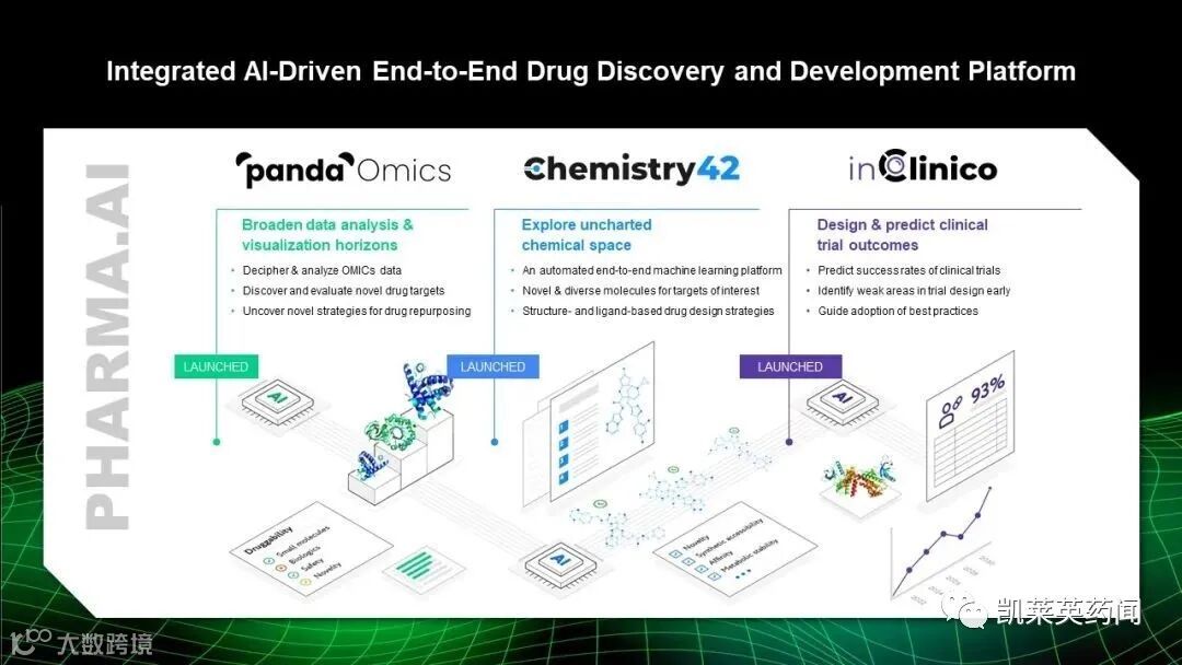 英矽智能开发了多种以生成对抗网络(GAN)驱动药物发现的方法和功能,并将这些算法整合到一体化、高度集成、端到端药物研发平台Pharma.AI。该平台覆盖生物学、生成化学和临床研究等多个领域,包括可商业化的靶点发现引擎PandaOmics,分子生成和设计引擎Chemistry42和临床试验结果预测引擎inClinico。