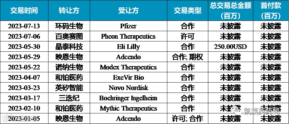 纵览2023年上半年,共有8家国内企业完成技术授权License-out,仅晶泰科技与礼来披露交易金额(2.5亿美元),其中和铂医药及其子公司诺纳生物产生的技术授权最多(3笔)。接下来,我们将对交易内容进行阐述,并对各国内企业的技术平台进行详细的解读。