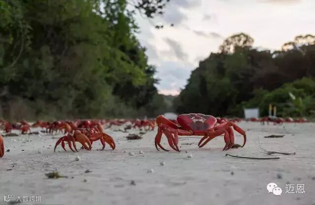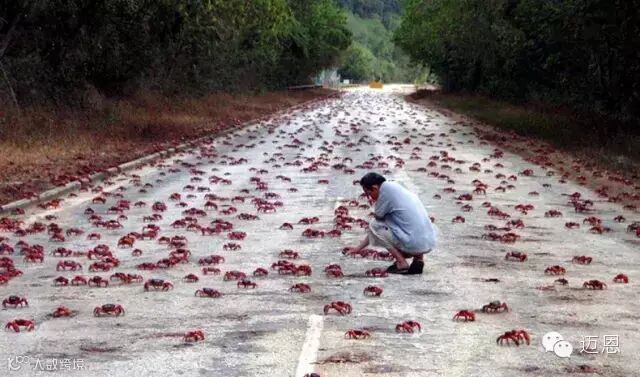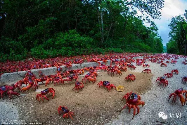 才不是!这是正在迁徙的澳洲红蟹!每年这种绯红的陆地蟹都会如红色海潮般从丛林涌向大海,上演一场壮观的大迁徙。