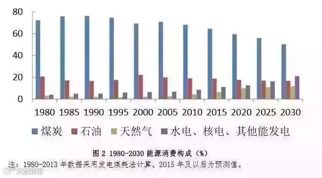 非化石能源的发展促进能源结构优化。预计到 2030 年,非化石能源占比由 2015 年的 12%上升到 21%。其中,核能 5.0%,水能 10.0%,生物质能 1.1%,其他可再生能源 4.9%(见图 2)。