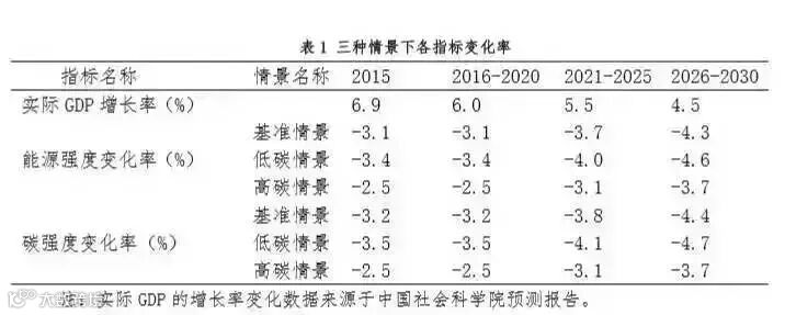正如《IEA 世界能源展望报告 2015》指出的,中国可能已经进入了一个能源强度大幅降低的发展阶段。本文在各个研究机构的成果基础上,按照 2010-2014 的经验,假设能源强度每年下降 4%,并且在2016-2030年间,根据能源强度的变化,分别设置了3种不同的情景,基准情景(达到 4%的降速),低强度情景(高于 4%的降速)和高强度情景(达不到 4%的降速),预测 2030 年前中国能源消费、能源消耗强度和碳排放量,进而从节能减排和降低能源消耗强度的角度,通过情景分析来探讨中国 2030 年能源消费总量和碳排放峰值的可能情景。