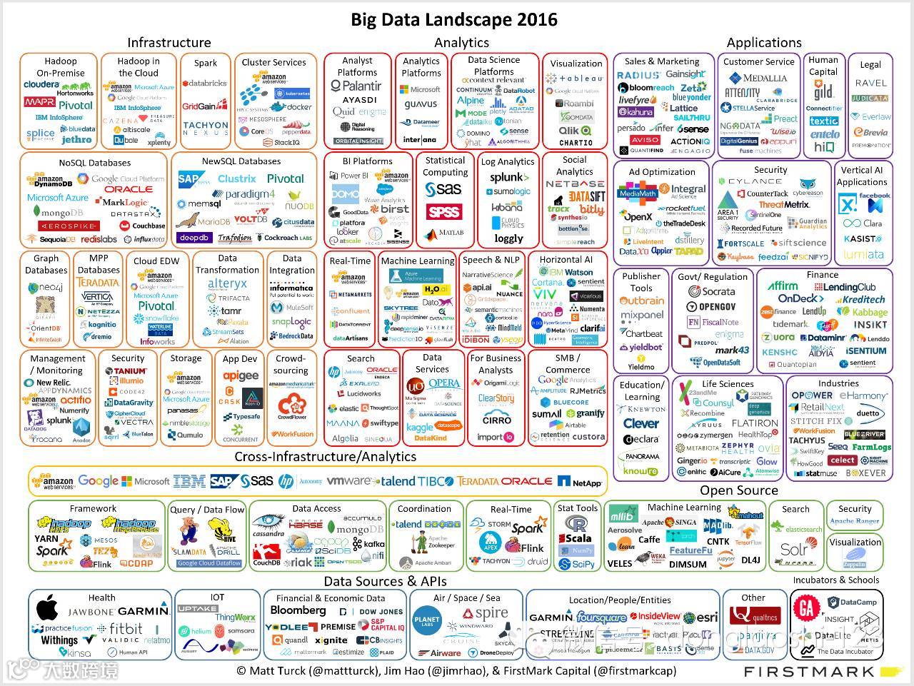 随创业活动和资金的持续涌入,有些不错的资本退出,日益活跃的高科技巨头(亚马逊,谷歌和IBM),公司数量不断增加,这里就是2016年大数据全景图: