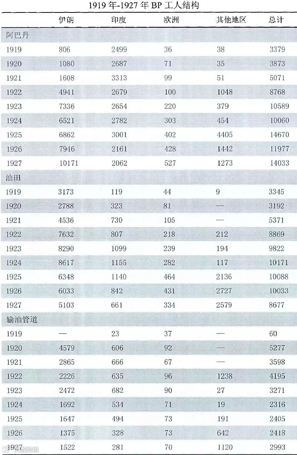 上表显示,20世纪20年代,伊朗本土工人从未超过BP在伊员工总数的70%,甚至在1922年以前,阿巴丹炼油厂的印度工人远远要多于伊朗工人。然而印度工人无法忍受恶劣的生产生活条件和低廉的工资,先后在1920年和1922年两次掀起罢工,BP无可奈何之下不得不开始招募伊朗工人,但是当地雇员和白人雇员在生活标准方面仍有很大反差。