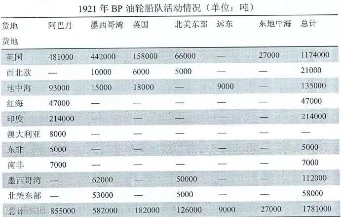 1921年,BP船队的活动范围已达英国、地中海、北美、墨西哥湾、波斯湾以及远东等地,年运载总量超过178万吨。