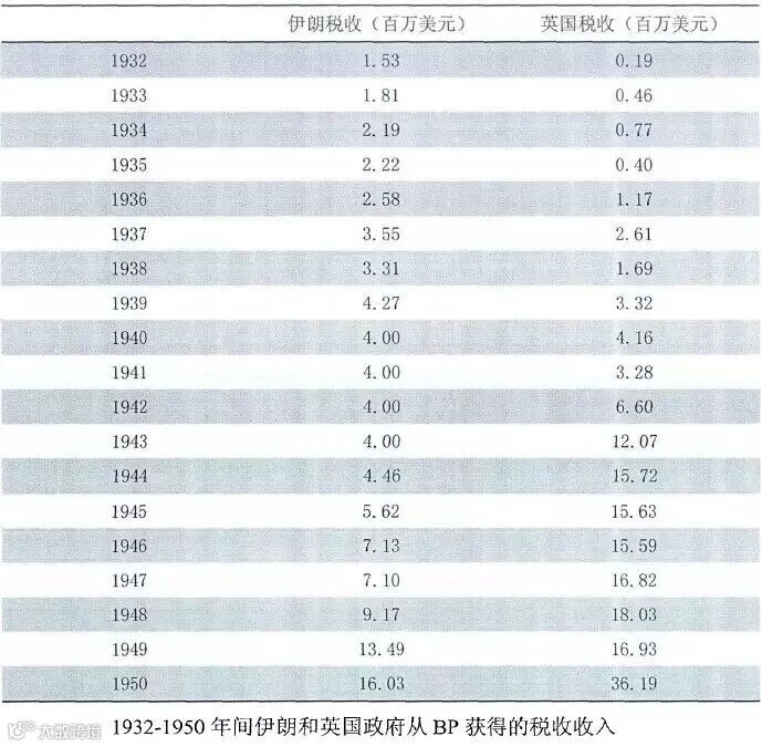 根据伊朗人的估计,BP从1914年到1953年摩萨台国有化运动为止“总营业收入为50亿美元,其中卖给英国海军部的廉价船用燃料占5亿美元,缴给英国财政部的税款为15亿美元,股东红利为3.5亿美元”。而根据BP自己的统计,从1932年到1950年间,它给英国政府上缴的税款总额达到了1.72亿英镑。