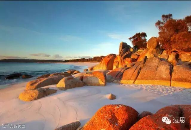 火焰湾离圣海伦北部开车半小时的距离,这一片海湾拥有白色的沙滩,以及因为苔藓而呈现橙色的花岗石。这些巨大的橙色岩石布满了海滩,在晴朗的蓝天下,色彩对比非常鲜明。