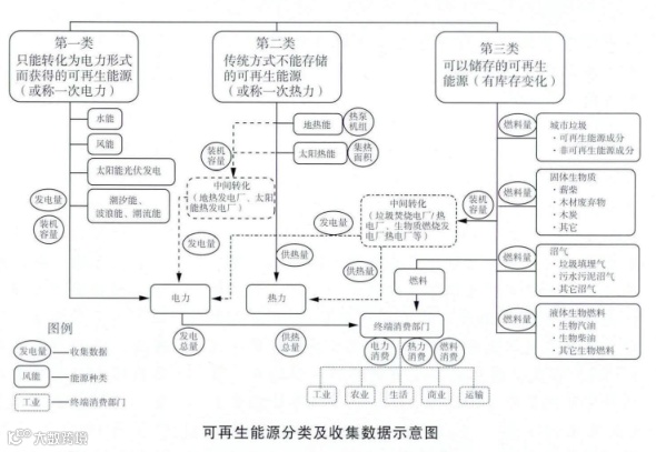 我国已经颁布的与可再生能源有关的统计报表制度有《电力行业统计报表制度》、《全国农村可再生能源统计报告制度》和《民用建筑能耗和节能信息统计报表制度》等。((全国电力行业统计报表制度》包含了并网水电、风电、太阳能光伏发电、生物质能发电、地热能发电和潮汐能发电等的发电量以及装机容量等数据收集,这些数据是可再生能源发电统计的主要信息。