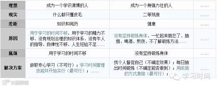 理想:写上我们理想中的状态,可以有很多方面(我也建议这样做)。比如健康、事业、家庭等。一开始可以随意点,想到什么就填什么。我建议大家可以先把所有YY过的理想状态都写上,然后再一列一列的完成这个表。