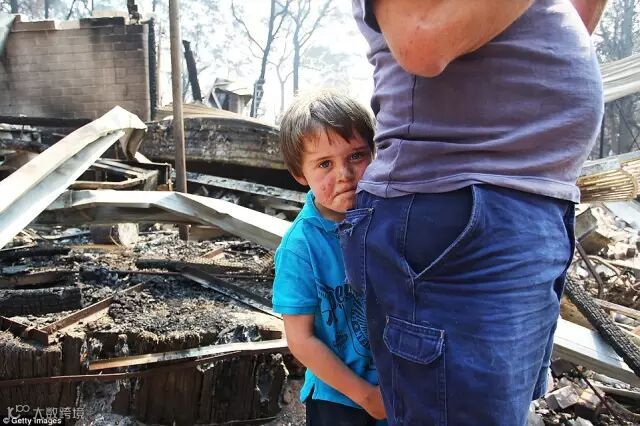 2013年新洲山火,孩子站在父亲身后。